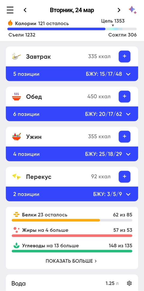 Съела сегодня на 1232 ккал, перебралась с жирами и углеводами, не добрала белков.