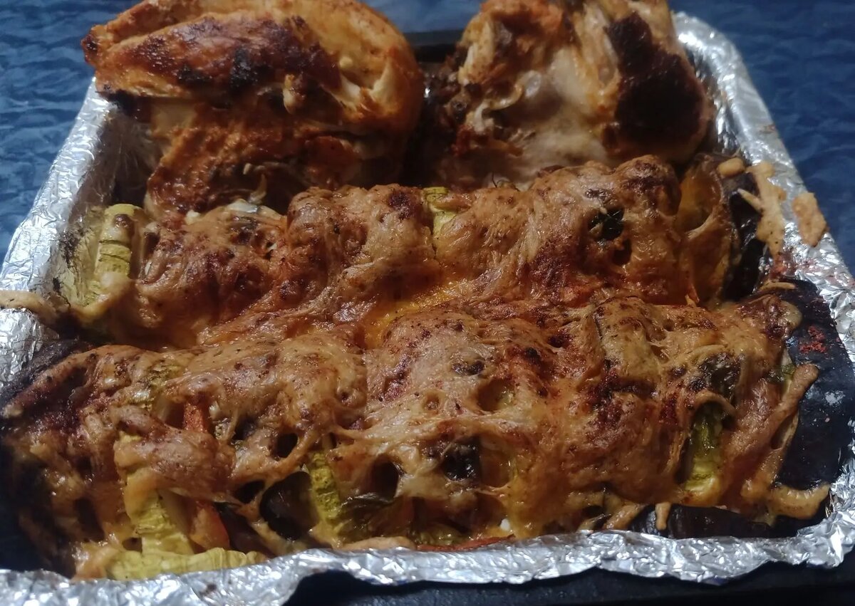 Тьен блюдо которое готовят из любых овощей чередуя их с сыром и ветчиной или мясом в нарезке. Добавляя зелень и специи. Если хотите более зажаренные овощи не посыпайте сверху сыром. Разноцветные кружки овощей красиво смотрятся и вкусные и в постном виде. Легко готовить. Ингредиенты: Все ингредиенты берите в равных пропорциях или в произвольном количестве. Ветчина или любое мясо готовое в нарезке или колбаса. 200 гр. Сыр 200 гр. Нарезка смотри фото.Приблизительно одного размера с овощами. Кабачок 200 гр. Нарезка кружками Баклажан 200 гр. Нарезка кружками. Помидор, Нарезка кружками. Зелень : любая зелень по вкусу. У меня по 2 веточки петрушки и укропа. Специи: чёрный перец, паприка, французские травы. Майонез для смазывания. Оливковое масло для поливки. Приготовление. Возьмите приблизительно одного размера овощи. Большие с большими чередуйте. Маленькие кружки с маленькими. Смотри фото. В произвольном порядке или всё по очереди раскладываем овощи в форме. Чередуйте кабачки с сыром и пом