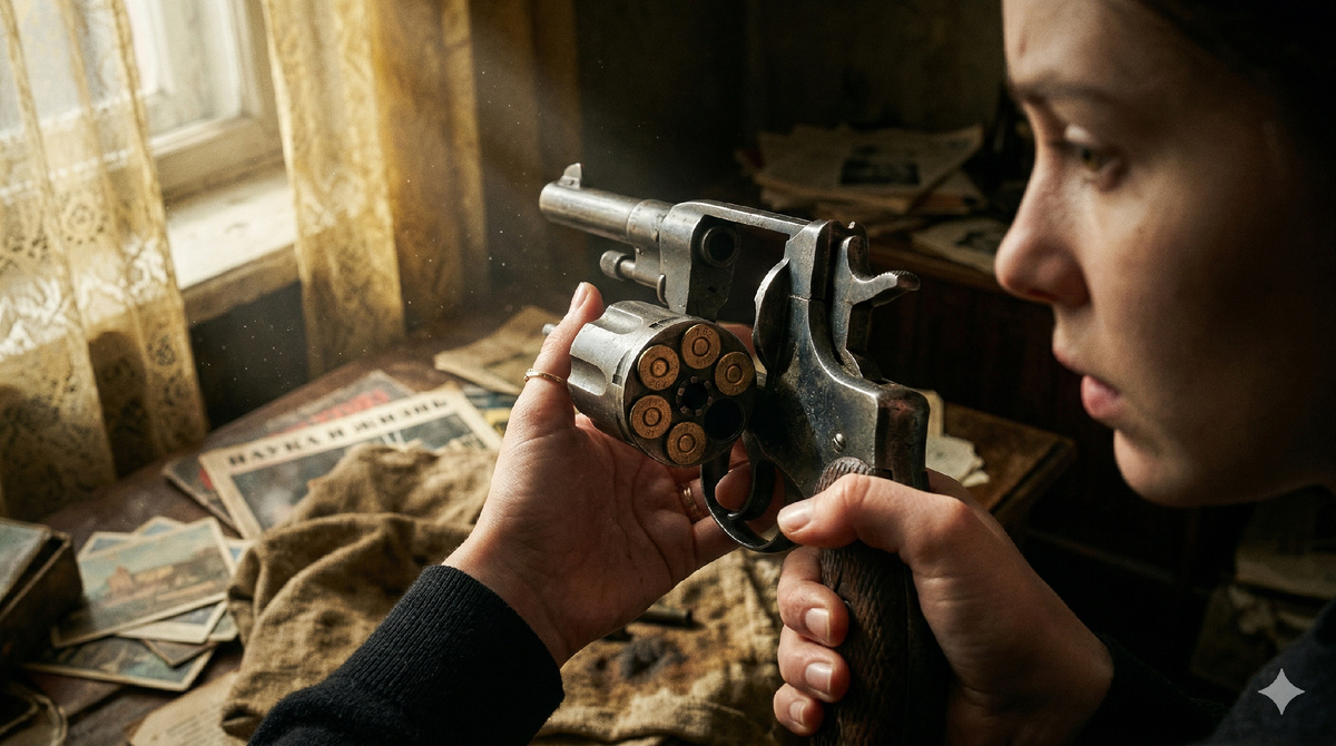 Сердце почему-то екнуло. Я осторожно потянула сверток на свет. Развернула. На мои ладони лег старый, потертый, тяжело и холодно блеснувший металлом револьвер. Настоящий наган. Я, конечно, девочка, и в оружии понимаю мало, но эту характерную форму с барабаном ни с чем не спутаешь. Дыхание перехватило. Мой дед, интеллигентнейший человек, всю жизнь проработавший инженером-проектировщиком, любивший разводить гладиолусы на даче и читавший мне в детстве сказки Бажова, хранил в столе боевое оружие. Руки слегка дрожали, когда я, повинуясь какому-то инстинктивному любопытству, нажала на фиксатор, который видела в кино. Барабан с тихим, зловещим щелчком откинулся в сторону. Внутри тускло поблескивали латунные донца патронов. Я начала их машинально пересчитывать, поворачивая тяжелый цилиндр пальцем. Один, два, три, четыре, пять, шесть… Седьмая камора была пуста. В барабане не хватало одной пули.