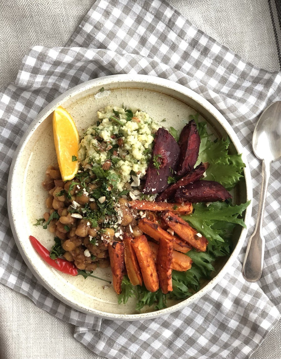 Готовая чечевица + шпинат + фета + оливковое масло.