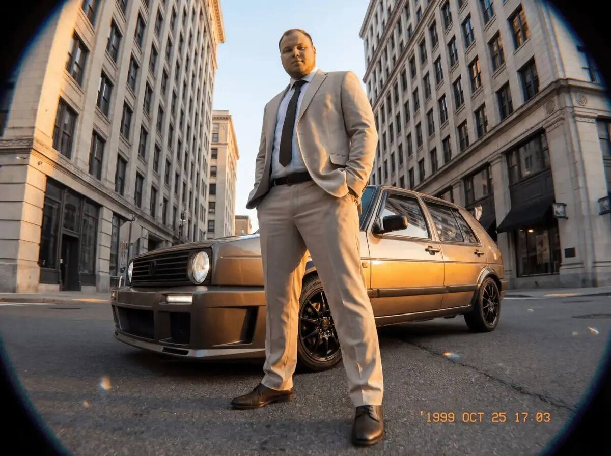 От подписчика @zlkotyara39rus Высокодетализированная гиперреалистичная модная фотография в стиле Y2K, на которой изображён человек с приложенного фото уверенно стоящая перед винтажным кориче-золотым Golf mk2 на городской улице. Человек на фото без очков его хорошо видно. Одет в светлый класический костюм Фото машины возьми с приложенного фото . Снимок сделан с очень низкого ракурса, близко к земле, с использованием мощного широкоугольного/мягкого «рыбьего глаза» объектива. Статическое положение камеры. Без вращения, без орбитального движения, без эффекта вращения. Перспектива слегка преувеличивает ноги из-за низкого ракурса объектива, но композиция остается стабильной и центрированной. Он стоит уверенно, ноги расставлены, руки в карманах куртки, бедра слегка смещены, плечи направлены к камере. Porsche припаркован прямо позади него, второстепенный, но хорошо видимый. Реалистичная текстура кожи с видимыми порами и микродеталями, без эффекта пластика. На нем черная кожаная куртка, че