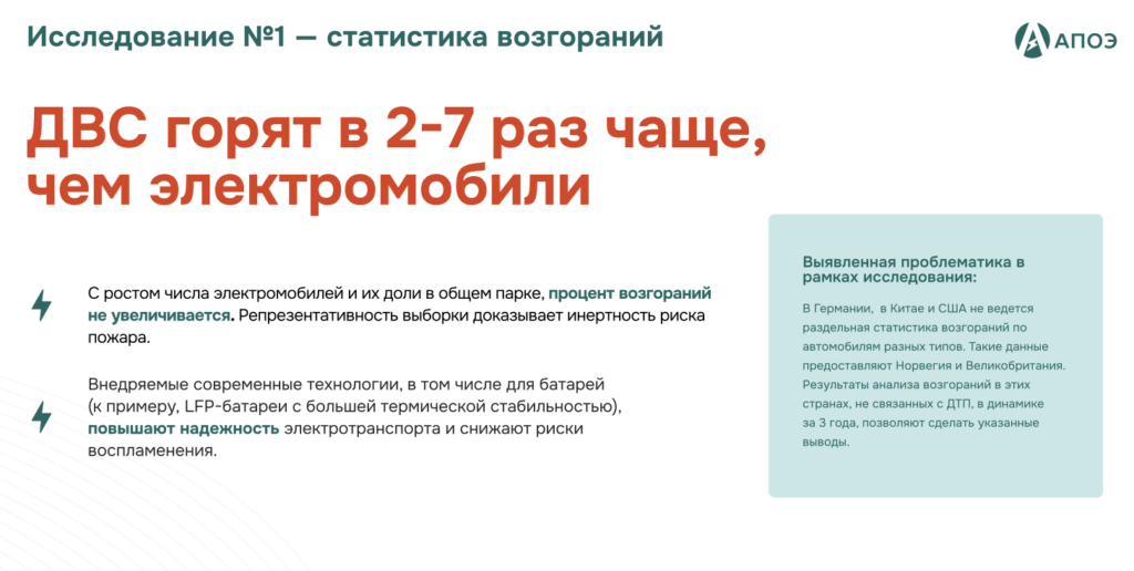 Об этом говорится в исследовании Ассоциации производителей и операторов электрозарядных станций. В ходе исследования был изучен опыт зарубежных стран с высоким уровнем распространения электромобилей: КНР, США, Норвегии, Великобритании и Германии. АПОЭ проанализированы статистические данные о возгораниях (не связанных с дорожно-транспортными происшествиями) в отношении автомобилей с ДВС, электромобилей, гибридов. Кроме этого, систематизированы нормативные требования в части обеспечения пожарной безопасности указанных стран и проведен сравнительный анализ требований с действующими и разрабатываемыми нормами в России. В странах-лидерах по электромобильности на федеральном уровне не устанавливаются повышенные требования пожарной безопасности к стоянкам с машино-местами для электромобилей, в том числе оборудованных ЭЗС – к ним применяются универсальные требования для стоянок с автомобилями ДВС. Автомобили с ДВС возгораются в 2-7 раз чаще, чем электромобили. При этом современные технологичес