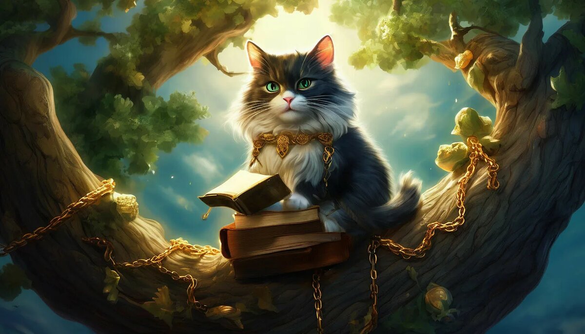 После посещения кафе мы двинулись к исполинскому дубу. И там я впервые увидела кота. Кот впечатлял. И пока я во все глаза восторженно разглядывала его, бабушка с выражением читала уже известный мне отрывок из поэмы «Руслан и Людмила».