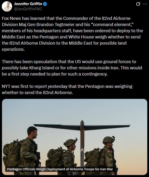 Командир 82-й воздушно-десантной дивизии генерал-майор Брэндон Тегтмайер и его "командное звено", члены его штаба, получили приказ о развертывании на Ближнем Востоке, пишет журналистка Fox News в X. 🔴 Читайте Sputnik Беларусь в MAX