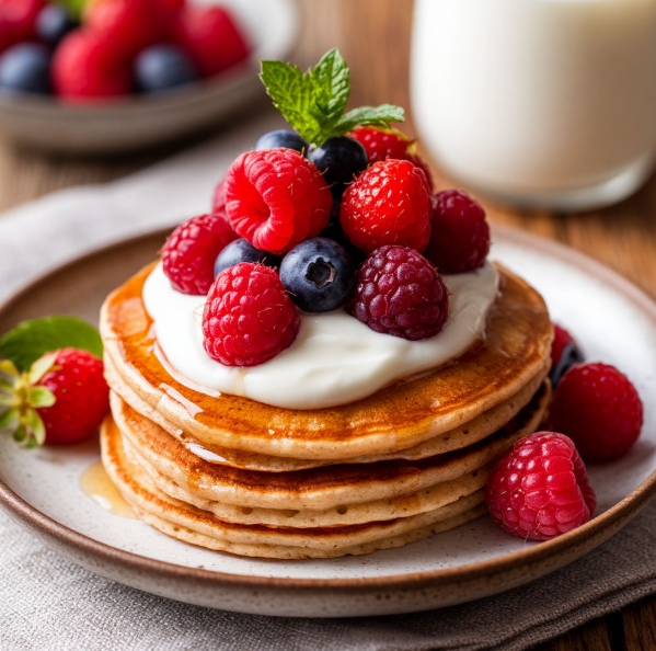 Подавайте панкейки теплыми, выложив стопкой. Полейте натуральным йогуртом, каплей меда или ягодным соусом. Украсьте свежими ягодами и листиком мяты. Идеально дополнят завтрак чашка свежесваренного кофе или чая.
