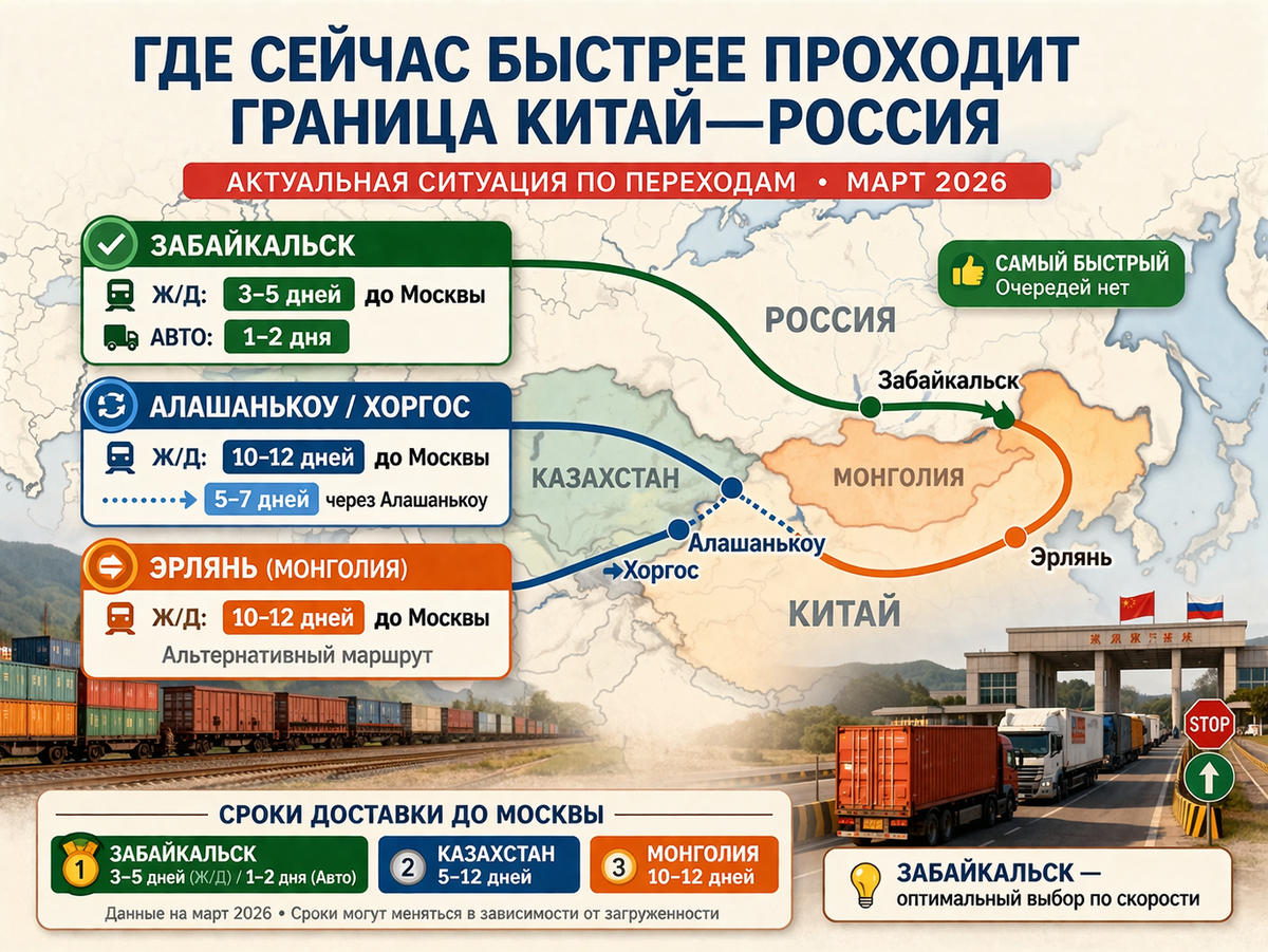 В 2026 году выбор пограничного перехода стал одним из ключевых факторов, влияющих на сроки доставки из Китая. Актуальная ситуация показывает: разница между маршрутами может достигать недели и более, поэтому неправильный выбор напрямую приводит к срыву сроков. По последним данным, наиболее стабильным и быстрым направлением остается Забайкальск. Здесь срок прохождения границы составляет в среднем 3–5 дней до Москвы, а по автомобильному направлению — всего 1–2 дня. При этом отмечается, что в отдельные периоды очереди практически отсутствуют, что делает этот переход одним из самых предсказуемых. Альтернативный маршрут — через Казахстан (Алашанькоу / Хоргос). Здесь сроки по железной дороге составляют 10–12 дней до Москвы, однако в некоторых случаях возможен более быстрый сценарий — 5–7 дней через Алашанькоу. Несмотря на это, нагрузка на данный коридор остается высокой, так как многие участники рынка переориентируются сюда в поиске более дешевых ставок. Еще один вариант — переход через Эрлян