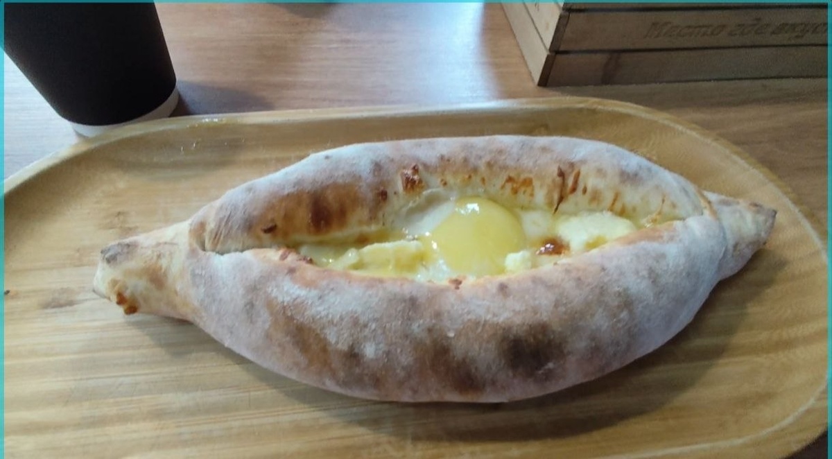 ". Взяли по кофе и хачапури по аджарски. Хачапури вкусное. Но! Мы пробовали его уже в разных местах. Мой вердикт - в Мимино оно самое вкусное 😊. Там меньше теста, оно толюньше, начинки больше. Сыр даже под бортиком, и размер больше. Но это хачапури было тоже вкусное, но намного меньше, а теста больше. Надеюсь, я разборчиво объяснила 🤣