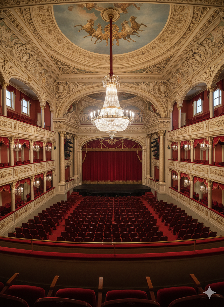 Зал был спроектирован архитектором Альбертом Кавосом после пожара середины XIX века и открылся оперой Глинки. Кавос добился феноменальной акустики, придав залу форму скрипки: стены отделаны резонансной елью, а деревянный плафон усиливает звук без потери качества. По легенде, знаменитая хрустальная люстра весом две тонны перед каждым сезоном опускается вниз для мойки — и это настоящее театральное событие само по себе.