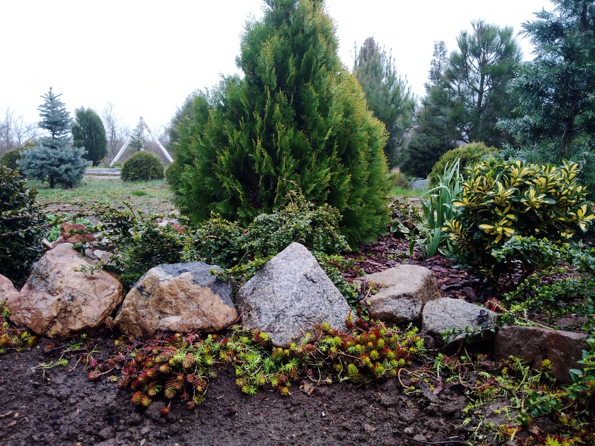 Мне кажется, что эта цветовая перекличка подчеркнёт красоту японского вариегатного бересклета и туи Ауреа Пирамидалис. Да и очиток займёт заслуженное почётное место в саду.
