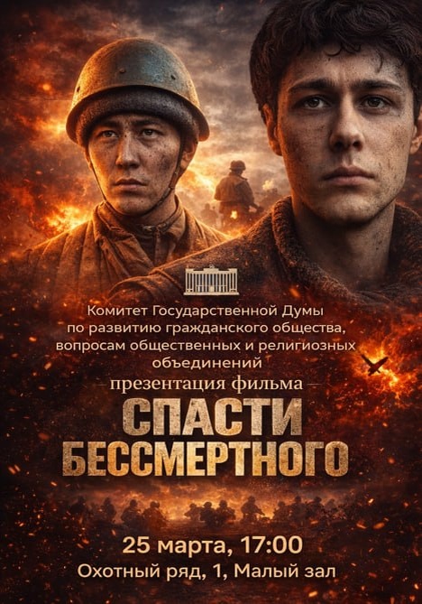 Когда: 25 марта 2026 года, 16:45–19:30 Где: Государственная Дума, Охотный ряд, 1, Малый зал «Спасти бессмертного» — совместный проект двух стран. Фильм рассказывает о настоящей истории кыргызского солдата Мендыша Омуралиева. В 1942 году он погиб в Ржевской битве. Спустя десятилетия поисковики нашли его останки и вернули домой, на Родину. 🔥 Главный герой картины — современный парень, который живёт так, будто бессмертен. Неожиданно его жизнь переплетается с судьбой погибшего солдата. Через эту историю фильм говорит о важных вещах: памяти о подвиге, связи поколений, ответственности перед прошлыми и настоящими. 🗒 Мероприятие организовано Комитетом Госдумы по развитию гражданского общества, вопросам общественных и религиозных объединений. Оно проходит в рамках официального визита парламентариев Кыргызстана в Россию. Спикеры: 👉 Яна Лантратова — председатель Комитета ГД по развитию гражданского общества, вопросам общественных и религиозных объединений; 👉Борис Чернышов — вице-спикер