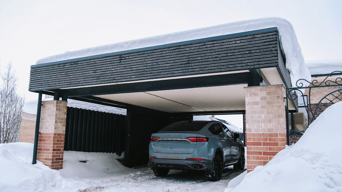 Каждый, кто задумывается о строительстве навеса для машины или зоны отдыха, хочет получить не просто «крышу над головой», а стильный, безопасный и продуманный объект. Чтобы он радовал глаз, служил десятилетиями и не создавал лишних хлопот — особенно зимой. Когда к нам обратился клиент Сергей, он чётко обозначил желание: навес должен быть современным, аккуратным и без проблем со снегом. Мы предложили ему решение, которое выходит за рамки стандартных конструкций, — и он с энтузиазмом его поддержал. Как мы воплотили эту идею в жизнь — рассказываю по шагам. А в конце вас ждёт полное видео, где показан весь процесс от 3D‑проекта до финального результата. Традиционные навесы чаще всего делают с открытой стропильной системой: снизу видны треугольные фермы, балки, иногда даже провода. Это классика, но сегодня она воспринимается как «что-то из 90‑х». Мы предложили Сергею закрытую стропильную систему. Все фермы и технические элементы спрятаны за декоративными фризами из ДПК. Обратите внимание: у