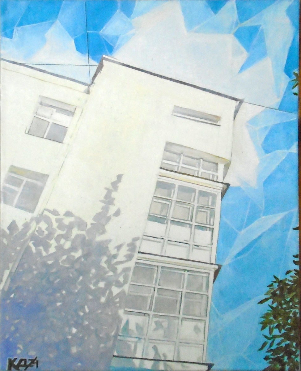 Белёсый август Холст/масло 40х50 На холсте запечатлено последнее мгновение уходящего лета. Городской дом в белёсом августовском свете. Дом жилой, конструктивистский, построенный в начале тридцатых. Ракурс с точки зрения пешехода. Дом устремлен ввысь. Почти акварельный колорит заставляет здание словно слиться с небом. Прозрачная тень от тёмных листьев. Предчувствие наступающей осени. Работа выполнена в стиле конструкционализма. Конструкционализм – это авторский стиль, наследие кубизма 1910-х – 1920-х годов. Можно также назвать его неокубизмом. Авторская концепция конструкционализма определяет мир как кристалл со многими взаимно пересекающимися гранями. Точки пересечения граней являются энергетическими узлами изображения и создают каркас, на котором строится пространство холста. Никакой эзотерики – чистая геометрия. Работа будет уместна в любых пространствах и интерьерах. [Клуб Успешных Художников: VerbArt Top 100]