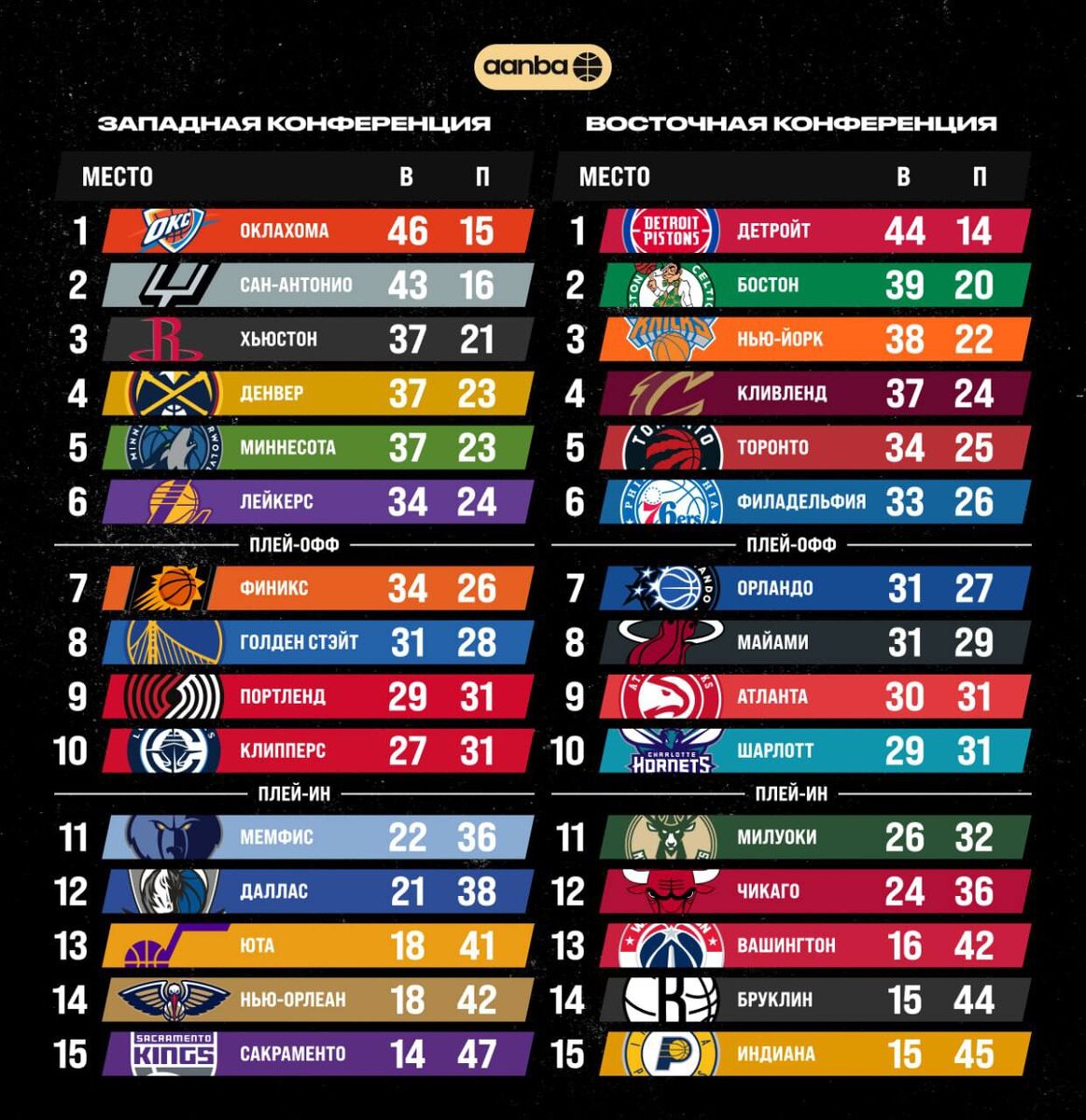 Текущее положение команд в турнирных таблицах НБА выглядит следующим образом
