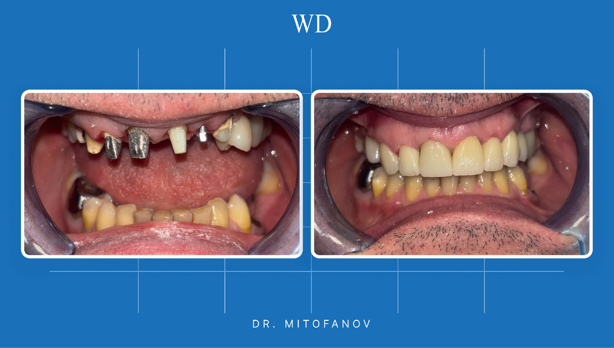 Многие пациенты годами живут со старыми металлокерамическими мостами, считая, что легкая синюшность десны или неестественный меловой цвет зубов - это неизбежная плата за протезирование. Но современная стоматология давно шагнула вперед. Сегодня мы разберем реальный кейс: как из уставшей металлокерамики сделать премиальную улыбку с помощью диоксида циркония и точной хирургии. В этом клиническом случае мы работали с фронтальным отделом верхней челюсти (зоной улыбки). У пациента стоял классический металлокерамический мост. В чем были главные минусы старой конструкции: Мы решили уйти от концепции моста в пользу естественной анатомии. Работа шла в два этапа: 1. Хирургия и восстановление фундамента В позиции 2.2 (боковой резец) мы установили односоставный имплантат Dentium. Это позволило нам не обтачивать соседние зубы под новый мост, а создать самостоятельную единицу, которая будет нести нагрузку как родной корень. 2. Ортопедия: магия диоксида циркония Мы заменили старый мост на одиночные к