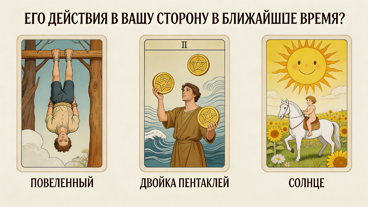 Он может начать делать конкретные шаги, но небольшие, осторожные. Проверять почву, смотреть на вашу реакцию, оценивать возможности. Двойка Пентаклей - это карта гибкости и адаптации. Он будет действовать ситуативно, реагируя на меняющиеся обстоятельства.