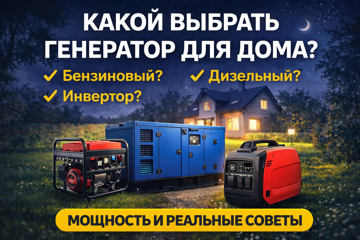 Всегда брать запас +20–30% Плюсы: Минусы: 👉 Идеально: редкие отключения Плюсы: Минусы: 👉 Идеально: частые отключения Плюсы: Минусы: 👉 Идеально: техника + электроника 👉 бензиновый 2–3 кВт 👉 бензиновый 3–5 кВт
