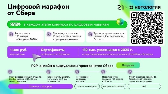 К участию приглашаются все желающие в возрасте старше 18 лет, чтобы проверить свой уровень владения цифровыми навыками. Победитель может выиграть 1 млрд рублей, а призеры получат призы от организаторов и партнеров конкурса. ❗️В этом году специально для «Цифрового марафона» создали виртуальное пространство, в котором участники могут общаться друг с другом, проходить квесты и получать баллы в общий зачет. 📎Регистрация и условия участия доступны до 3 апреля по ссылке: clck.ru/3She4v