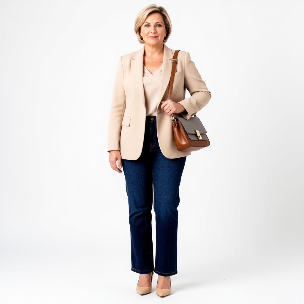 Это женщина — воплощение уверенной зрелости. Короткая стрижка подчёркивает чёткие черты лица, а деловой кэжуал облекает её в ореол сдержанной элегантности. Бежевый блейзер свободно ниспадает на плечи, сочетаясь с тёмно-синими джинсами прямого кроя — симбиоз строгости и непринуждённости. Телесные туфли на каблуке добавляют лёгкости, а серо-коричневая сумка через плечо завершает образ, словно подчёркивая: «Я знаю цену времени и стилю».