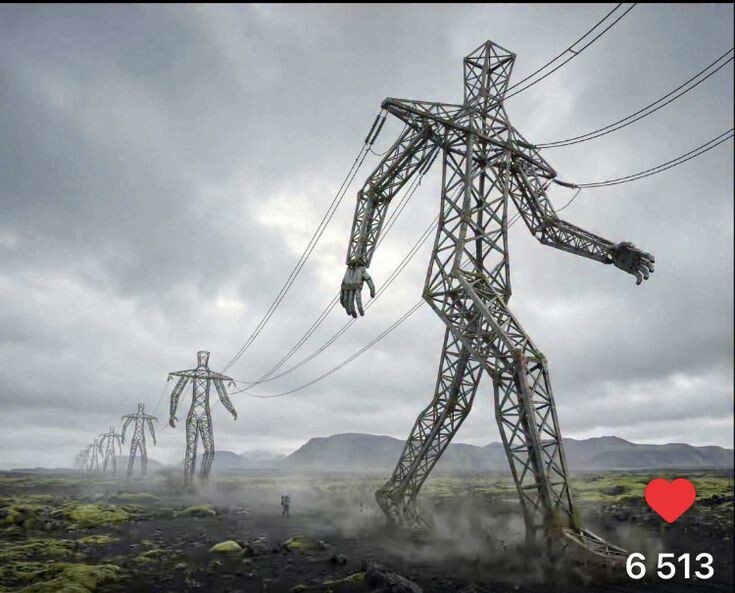 Важно: в Исландии эти фигуры так и не построили, хотя проект участвовал в конкурсе местного оператора сети Landsnet и получил кучу архитектурных наград, выставлялся в музеях. Но визуальные рендеры разошлись по соцсетям, и до сих пор многие уверены, что где‑то в исландских полях действительно стоят люди‑гиганты с проводами.