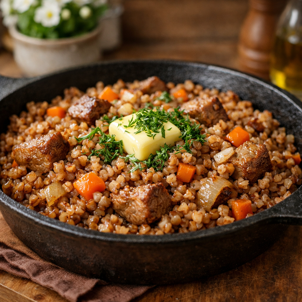 А секрет этого рецепта оказался намного проще, чем я думала… Раньше я всегда варила крупу в отдельной кастрюльке, а мясо с овощами жарила отдельно, а потом просто всё смешивала. Но когда я узнала эту маленькую, но гениальную хитрость с предварительным прогреванием крупы и томлением в густом мясном соусе, моя привычная гречка с мясом на сковороде превратилась в настоящий ресторанный шедевр с невероятным вкусом!