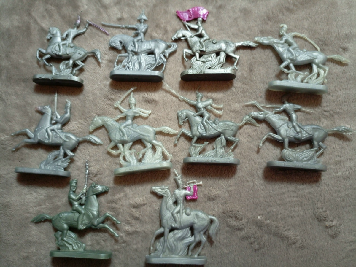 Ave любители солдатиков! Сегодня в нашей постоянной рубрике выходит обзор плоских советских солдатиков. Фотографии - Богуслав Рыбин. Приветствую, на обзоре набор «Конники 1812г.». 1981 год. Производство сначала «Малыш» затем «Прогресс». Скульптор Савельев Б. Д. Всего существует 17 разных солдатиков. На попоне фирменная ладошка, то ли завода «Малыш», то ли скульптора Савельева (что это знак именно Савельева, говорит «Ледовое побоище» уже Астрецовского завода игрушек, на попонах которого также присутствует знак ладошка). Материал во основном Полиэтилен, но есть и полистирол, у меня знаменосец(чему я потом оказался, очень огорчён, со временем трескается). У всех присутствует как дополнительное украшение на подставке- высокая трава, может отличаться у одинаковых фигурок. Размер вместе с подставкой максимально- 70мм. Я их покупал с рук, во основном на Удельной в 2008-2011гг. На подставке присутствуют два вида ценников 11 и 12 копеек (ценник может быть и перевёрнутым). Первый Полковник (оф