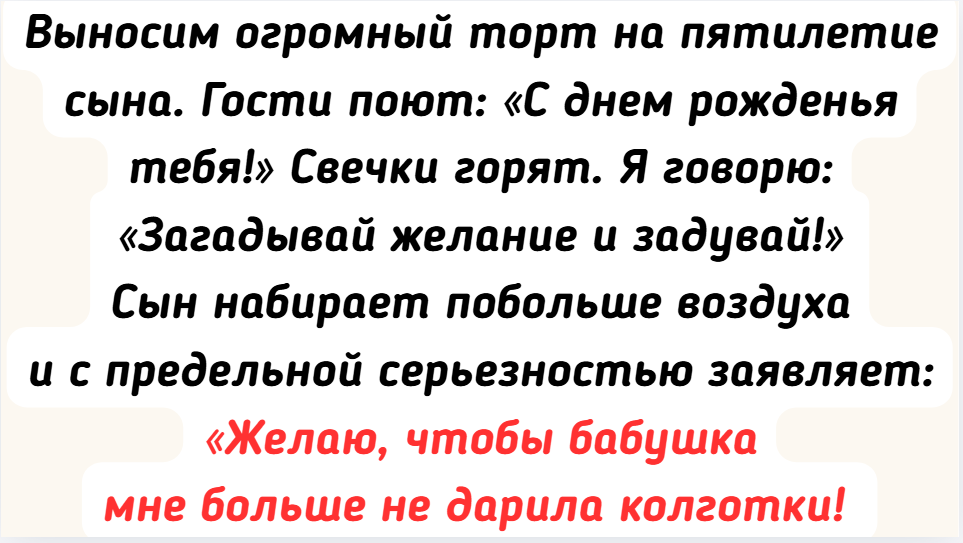 - Выносим огромный торт на пятилетие сына. Гости поют: «С днем рожденья тебя!» Свечки горят. Я говорю: «Загадывай желание и задувай!» Сын набирает побольше воздуха и с предельной серьезностью заявляет: «Желаю, чтобы бабушка мне больше не дарила колготки! Мне нужны роботы!» И мощно задувает все свечи разом. Бабушка поперхнулась чаем, дедушка зааплодировал, а торт мы резали под дружный хохот гостей. Колготки сыну больше не дарят.