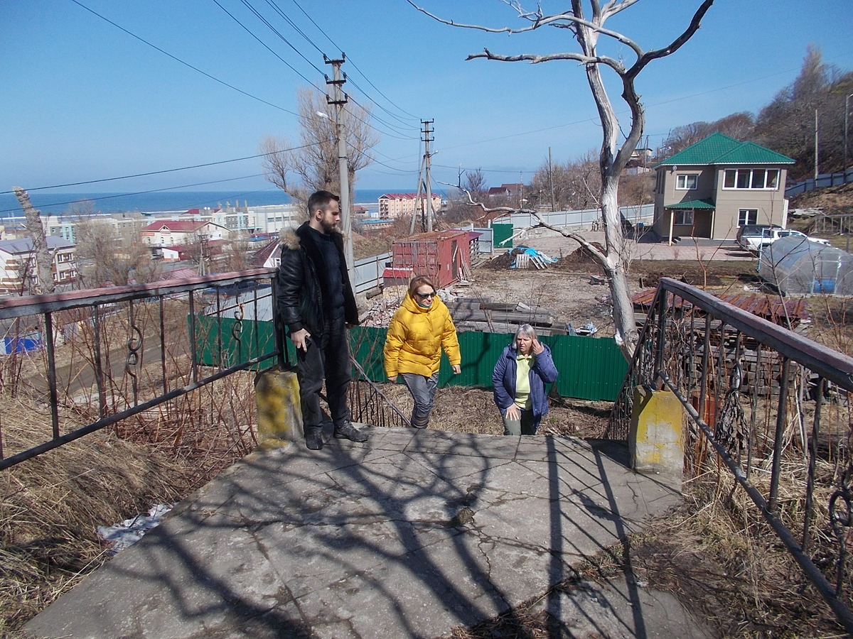 Весна в 2022 году начала вступать в свои права. Побережья к началу апреля уже хорошо протаивают. Так как весенние процессы в широтном направлении у нас идут с запада на восток, то в апреле при первой же возможности мы стремимся выехать на западное побережье. Воскресенье 10 апреля выдалось погожим. Решили в тот день выехать со знакомыми туристами Михаилом, Ириной и Мариной на автомобиле Михаила в Невельск. Это уже стало для многих традицией в весеннее время ездить туда наблюдать сивучей, но не только их. Над городом на склоне сопки, где некогда во времена правления японцев располагался синтоистский храм, сейчас располагается православный храм Рождества пресвятой богородицы. Подъехали туда, сколько смогли, затем увидели лестницу и поднялись по ней пешком. Слева направо: Михаил, Ирина и Марина. Открылся вид на город. Храм был закрыт на замок (позже на наших глазах большая делегация взрослых и детей открыла тот замок и вошла в храм). Смотрим: от храма протянулась дорожка на юг. Прошли п