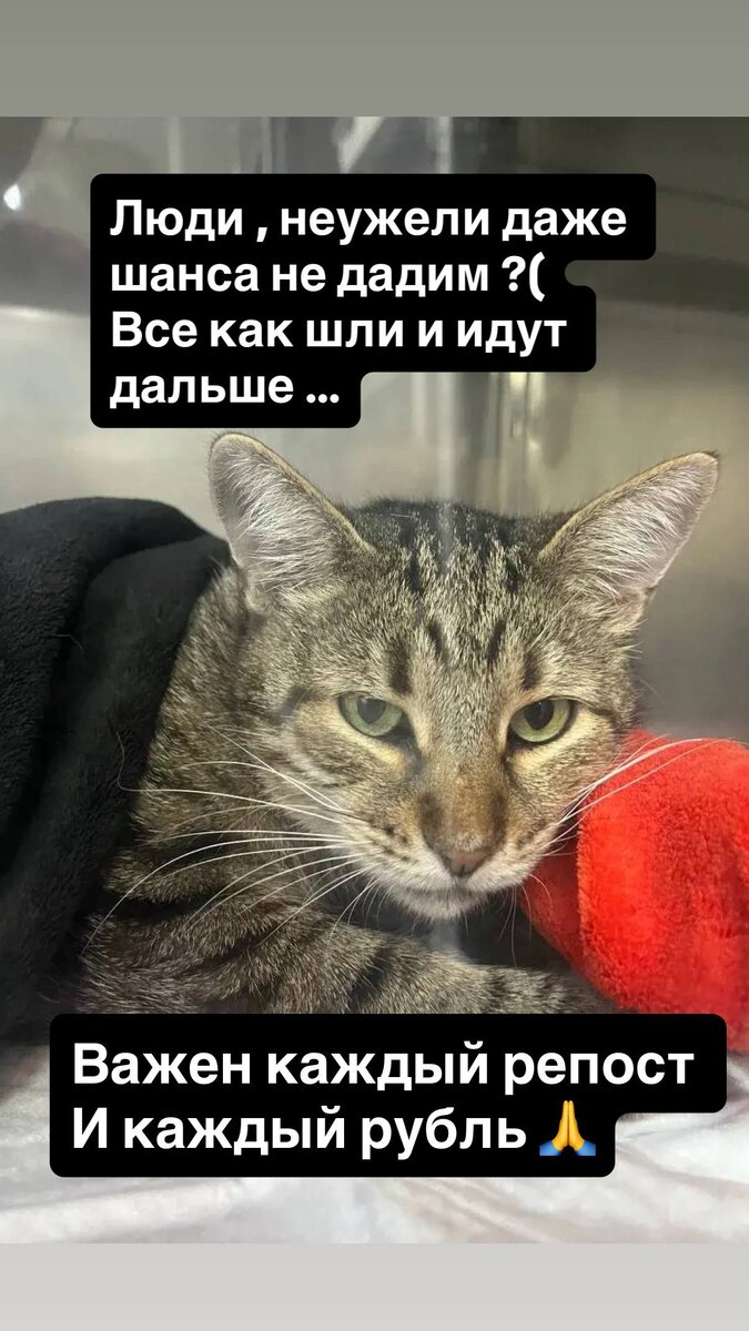 .. у меня еще надежда есть , что вы нас услышите 🙏💔 - Кто нибудь скажет мне … когда же это закончится ?( Я вот час сидела и думала что писать … Пишу как есть : ситуация критическая 😵кот в тяжеленном состоянии . Температуру без грелки не держит , кровь в моче сохраняется алого цвета По узи отслойка мочевого Почки очень плохие ! Если почки у него уже были хронические , то там много и не надо… Время нельзя терять , попробовать можно , но может не дотянуть … В клинике долг итак 300 тыс , мы просто не можем наглеть , помогите ..кто сколько может ! Нам нужно за котика оплачивать и долг погашать 😭 📍Реквизиты для помощи (с пометкой “пожертвование котик » 💳 Сбербанк — +7 928 176 80 80 (Яна Валерьевна Ч.) 💳 Т-Банк — 2200 7007 6884 7666 💳 Альфа-Банк — 2200 1523 7828 7638 💳 Сбер — 4276 5207 7145 7047 (Яна Валерьевна Ч.)