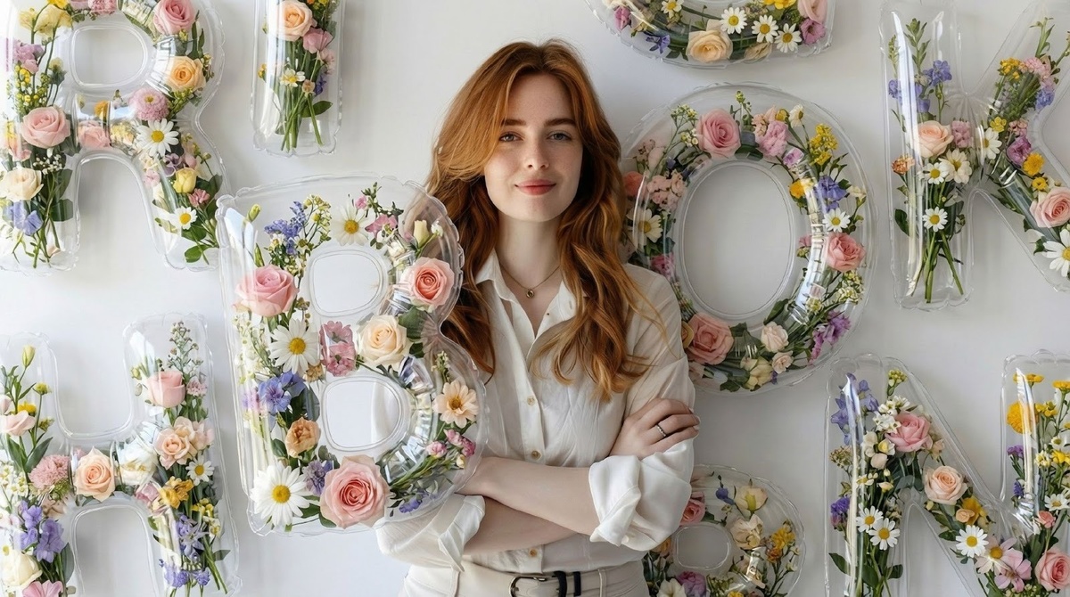 Используй загруженное фото как основу. Сохрани внешность человека на 100%: точные черты лица, пропорции тела, позу, одежду, угол камеры, кадрирование и окружение. Человек должен оставаться полностью узнаваемым и неизменным. Не перемещай, не обрезай, не изменяй размер, не стилизуй и не заменяй человека. Добавь гигантские объёмные 3D-буквы из прозрачных надувных шариков. Буквы сделаны из прозрачного пластика. Внутри каждой буквы: — живые цветы в пастельных тонах: розы, ромашки, полевые цветы, зелень — плотное цветочное наполнение, декоративное и насыщенное — видимые швы, складки, давление воздуха — реалистичные отражения и преломления сквозь пластик Буквы ведут себя как реальные физические объекты в пространстве: — прижимаются к стенам, потолку, полу — перекрывают друг друга — частично выходят за края кадра — окружают человека со всех сторон Физическое взаимодействие с человеком: — буквы касаются плеч, рук, спины или ног — деформация в местах касания (мягкое сжатие) — человек не скрыт, но явно ощущает физическое присутствие букв Реализм: правильная гравитация, реалистичный вес и давление воздуха, естественная деформация в точках контакта, корректная перспектива. Освещение: буквы наследуют точное освещение оригинальной сцены, реалистичные тени на стенах, полу и человеке, отражения соответствуют среде. Стиль: ультрафотореализм. Никакого CGI-вида, никаких иллюстраций. Всё должно выглядеть физически присутствующим и реальным.