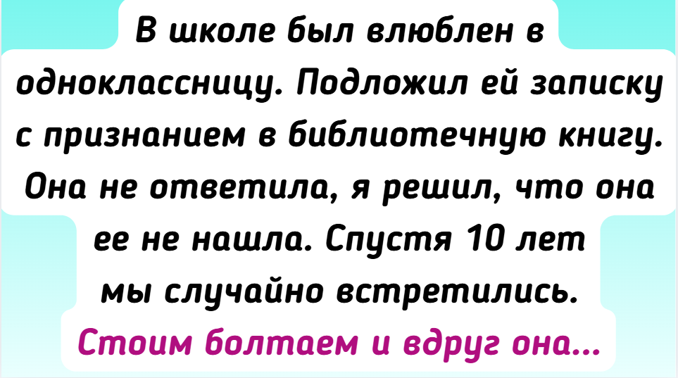- В школе был влюблен в одноклассницу. Подложил ей записку с признанием в библиотечную книгу. Она не ответила, я решил, что она ее не нашла. Спустя 10 лет мы случайно встретились. Стоим болтаем и вдруг она говорит: «Я тогда твою записку нашла, ответила на нее, но в последний момент побоялась признаться и вернула книгу в фонд». Мы тут же помчались в школу, уговорили библиотекаря пустить нас в архив и среди сотен томов нашли тот самый учебник. Ее «Да», выведенное карандашом, все еще было там. А сегодня мы с ней идем на свидание.