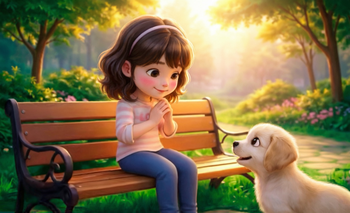 Я взял историю про котенка и щенка, которые подружатся во дворе. Все начинается с того, что котенок играет с мячиком. Внезапно из дома выбегает щенок — ему тоже хочется поиграть, но котенок пугается и убегает. Щенок аккуратно подкатывает мячик обратно лапой. Котенок останавливается, присматривается, потом медленно возвращается. Так начинается их игра: они перекатывают мяч друг другу, бегают наперегонки. Девочка-хозяйка выходит на крыльцо, видит эту сцену, улыбается и садится на ступеньки наблюдать. В конце они вместе возвращаются в дом.