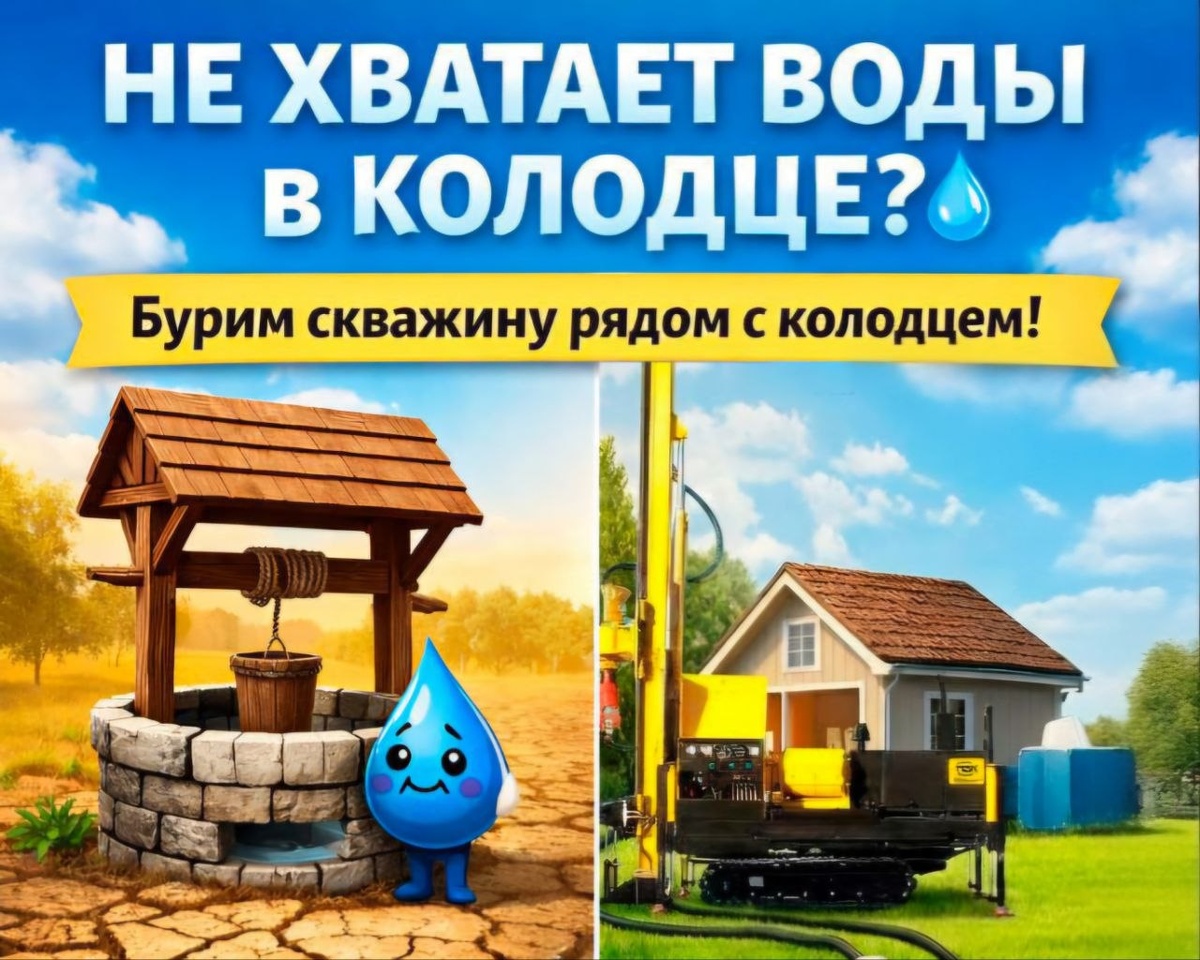 Часто к нам обращаются клиенты, у которых в колодце не хватает воды — особенно в засушливый сезон или при увеличении расхода в доме. В такой ситуации оптимальное решение — бурение скважины как более стабильного источника водоснабжения. Если на участке уже есть колодец, это не мешает бурению. Важно лишь соблюдать расстояние — не менее 5 метров. Это позволяет: — исключить попадание бурового раствора в колодец — избежать обвала грунта — обеспечить удобный подъезд техники — упростить обслуживание После бурения скважину можно обустроить двумя способами: 1. Через кессон — защита от промерзания — удобный доступ к оборудованию — экономия места в доме 2. Через адаптер — более бюджетное решение — гидробак и блок автоматики размещаются в доме — подходит, если позволяют параметры скважины, глубина загрузки насоса до 50 метров В результате вы можете не отказываетесь от колодца, оставить как резервный на случай отключения электричества