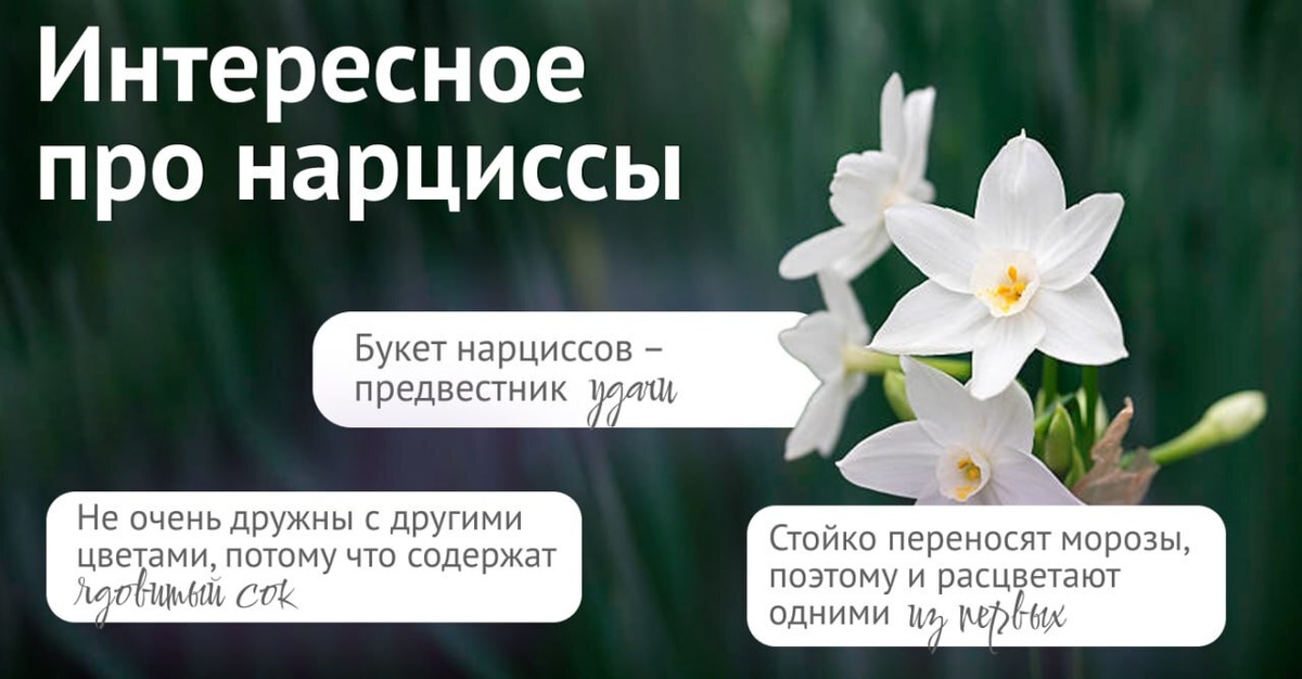 Вы знали, что существует легенда, согласно которой дарить один нарцисс — к несчастьям? А вот букет, наоборот — предвестник удачи. Этот и другие интересные факты об этих цветах смотрите в нашей карточке.