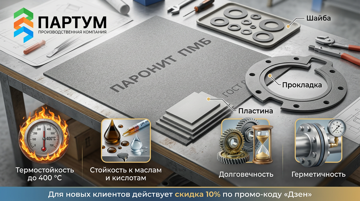 Если вам нужен паронит ПМБ или прокладки из него, их можно купить в ООО "Партум". Для новых клиентов действует скидка 10% по промо-коду "Дзен".
