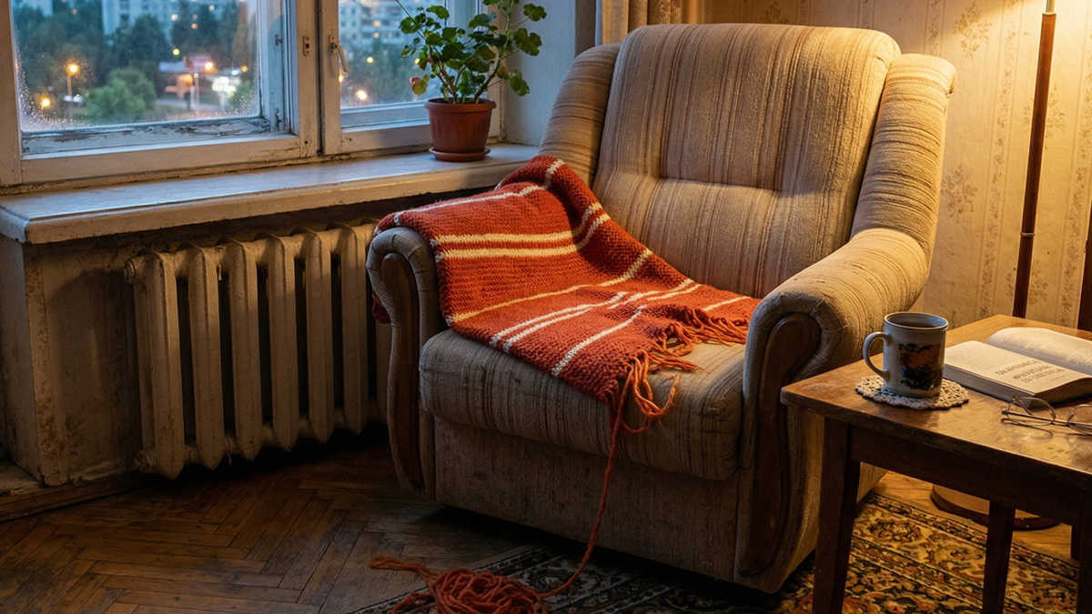 Я стояла на кухне и смотрела на кресло у окна. На нём лежал плед – рыжий, с белыми полосами, наполовину довязанный. Край распущен, нитка свисала до пола, и утреннее солнце ловило её, делало золотой. Пахло вчерашними щами – мама приносила кастрюлю, как всегда не спросив, хочу ли я щей.