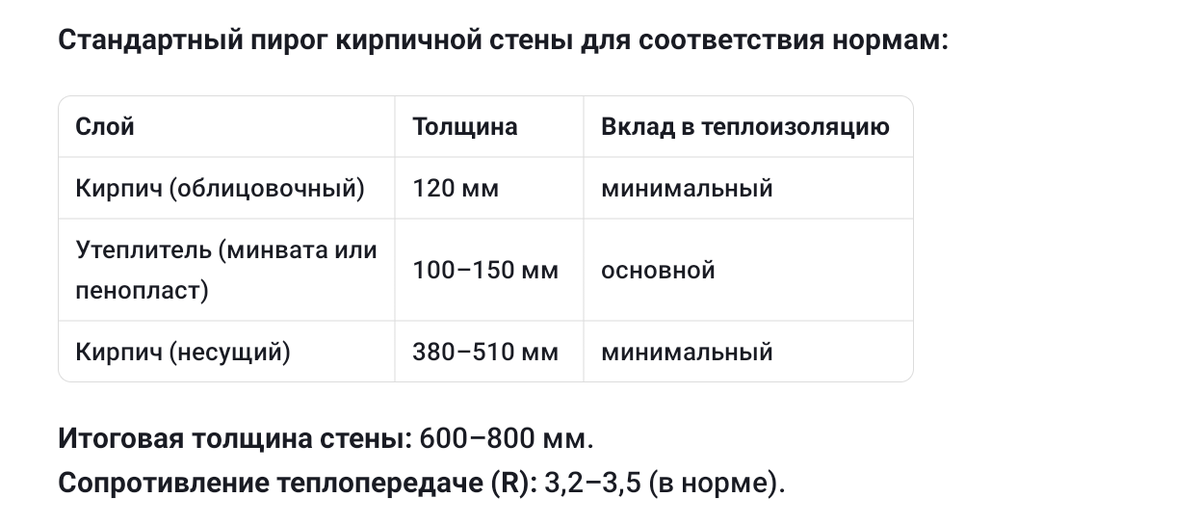 · Без утепления кирпичная стена в 2,5 кирпича (640 мм) дает R ≈ 1,2–1,5. Это в 2–3 раза ниже нормы.
