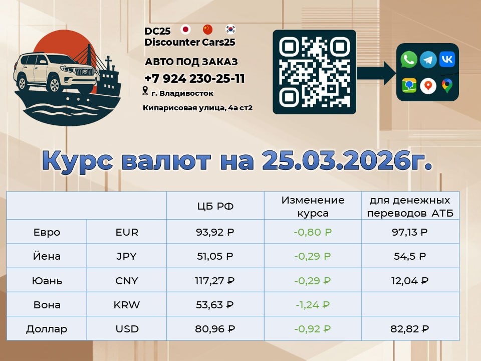 от Discounter Cars25🚗 Друзья! Если Вы рассматриваете автомобиль из Японии, Кореи или Китая, то ключ к выгодной сделке — в актуальных курсах. Наши автомобили, которые можно приобрести по фиксированной цене ТУТ➡️ DROM.RU‼️ Каждая валюта влияет на Вашу будущую машину: 💸 Евро — пошлина рассчитывается исходя из курса Евро в день таможенного оформления. 💴 Йена — определяет цену авто в Японии. 🇨🇳Юань — курс для покупки в Китае. 🇰🇷 Вона — основа для сделок в Корее. 💵 Доллар (санкционный) — для расчета авто с объемом двигателя от V-1.9. Именно эти цифры позволяют нам просчитать конечную стоимость «под ключ» без скрытых сюрпризов. Хотите себе автомобиль из Японии, Кореи или Китая? Для консультации и расчета, напишите или позвоните нашим специалистам: 📞  +79242302511 ✍️ Написать в What's App 🌐 Наша визитка ‼️ Мы в МАХ ✔️ Мы на Drom.ru 🚗 📱 Мы в ВК ✔️ Мы в Дзен ‼️Удачного дня‼️ DC25 Discounter Car's25. АВТО под ЗАКАЗ 🇯🇵🇰🇷🇨🇳 г. Владивосток ул. Кипарисовая 4-А ст2. Удачног