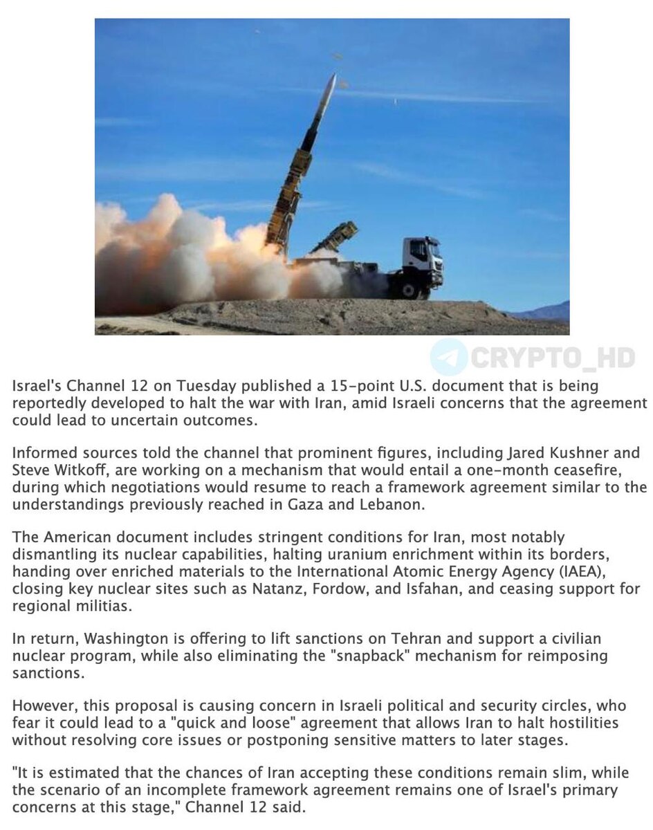 ❗️🇮🇷 Channel 12: Команда Трампа прорабатывает механизм прекращения боевых действий в Иране ▪ Предлагается месячное перемирие как первый этап. ▪ В этот период – переговоры по плану из ~15 пунктов. ▪ Условия включают ограничения ядерной программы в обмен на снятие санкций. Кушнер и Уиткофф настаивают на быстром заключении «рамочного соглашения». Crypto Headlines