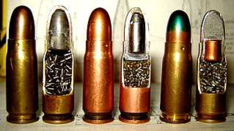 Патроны для пистолета ТТ: слева пуля со свинцовым сердечником, в центре со стальным сердечником, справа с бронебойной пулей.