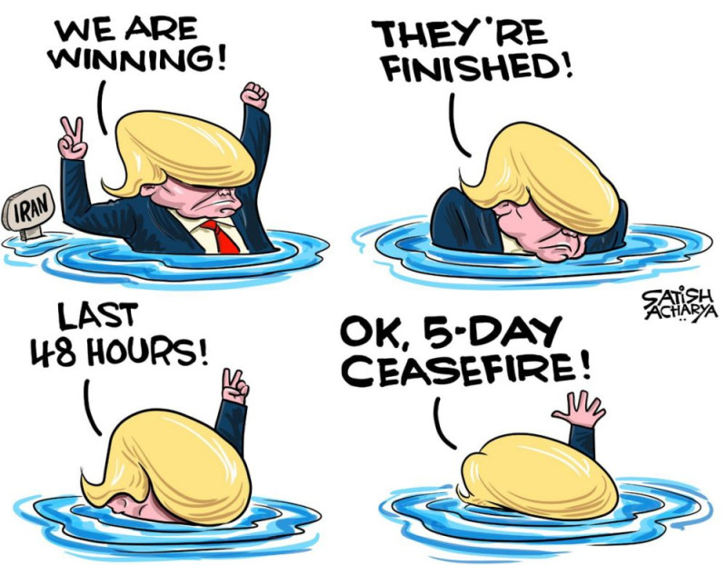 Погружаясь в трясину под названием «Иран», Дональд Трамп бодро восклицает: «Мы побеждаем!». «С ними покончено!». «Осталось 48 часов!». «Ок, 5-дневное перемирие!». Рисунок Сатиша Ачарьи (Индия)