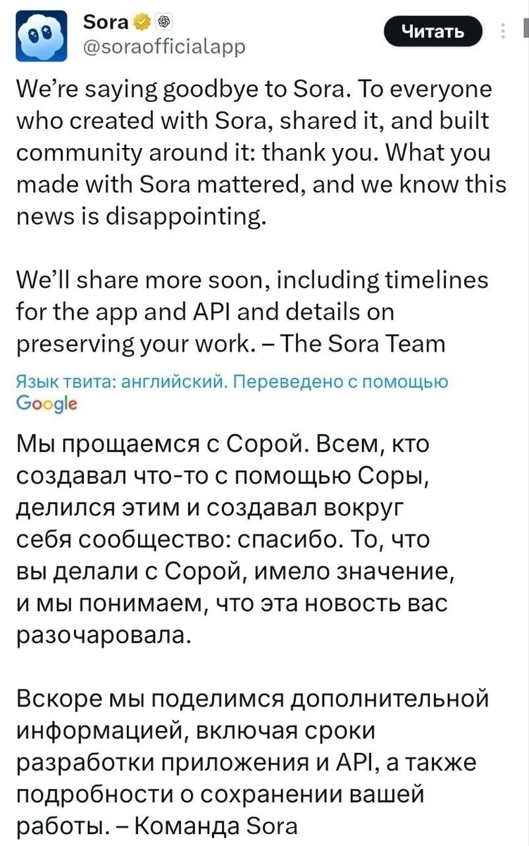 ) Sora закрывается — OpenAI буквально прекращает работу самого популярного бесплатного приложения для генерации видео. «Всем, кто создавал что-то с помощью Sora, делился этим и создавал вокруг себя сообщество: спасибо. То, что вы делали с Sora, имело значение, и мы понимаем, что эта новость вас разочаровала». https://dzen.ru/media/donetskdpr/sora-zakryvaetsia--openai-bukvalno-prekrascaet-rabotu-samogo-populiarnogo-besplatnogo-prilojeniia-dlia-generacii-video-69c2f7d4c6365744d4dee44e