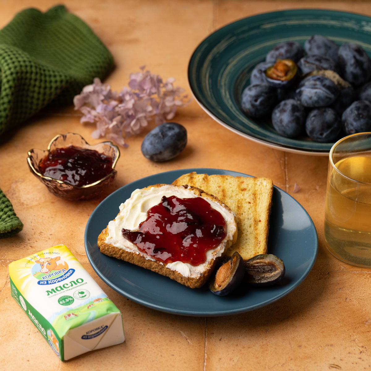 Приготовьте простой, но аппетитный завтрак — тосты со сливочным маслом «Коровка из Кореновки» и сливовым джемом.