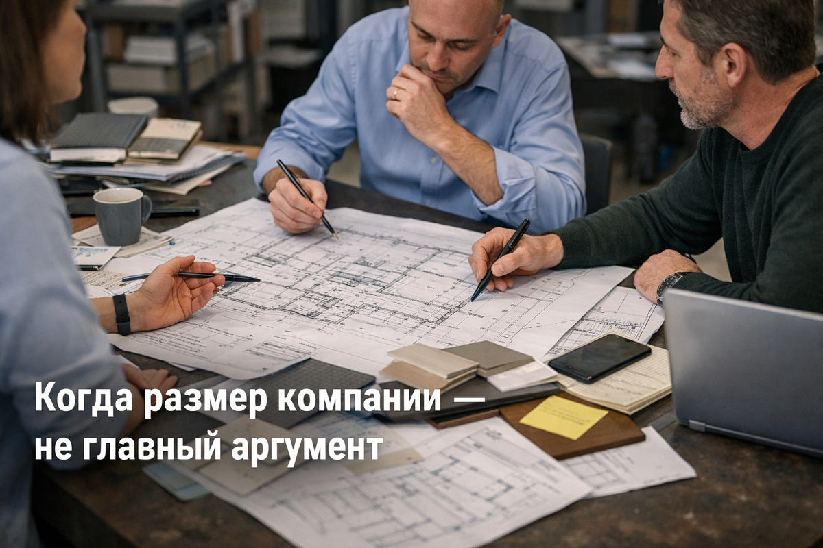 Но если человеку нужен не массовый продукт, а его собственный проект, логика выбора меняется. Он ищет уже не самых больших, а тех, кто действительно включится. Кто задаст лишние вопросы. Кто не побоится сказать: “Вот это решение на бумаге выглядит красиво, но в жизни потом создаст проблемы”.