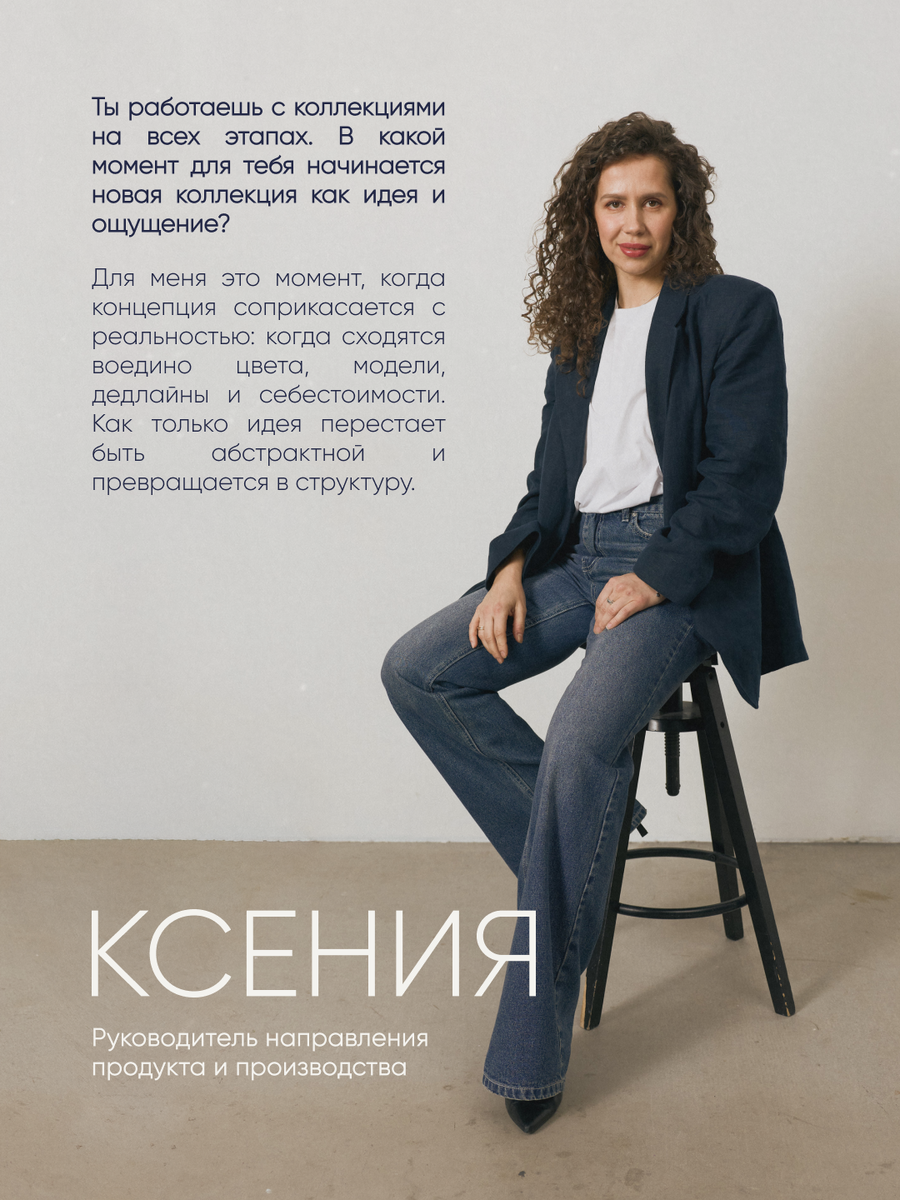 За каждой коллекцией стоит не только вдохновение, но и точная работа с формой, материалами и процессами. Мы поговорили с Ксенией, руководителем направления продукта и производства, о том, как рождается коллекция, где заканчивается идея и начинается структура, и что на самом деле важно в одежде сегодня.