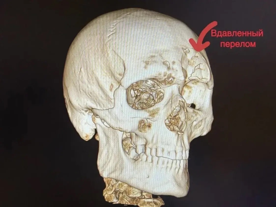 Медициной катастроф из города Арсеньев во Владивостокскую клиническую больницу №2 доставили пациента 38 лет со сложным диагнозом: ушиб головного мозга, многооскольчатый вдавленный перелом передней стенки лобной пазухи слева со смещением отломков. Вдавление в области лба было настолько выраженным, что привело к асимметрии лица. Клиническая картина подтверждала данные обследования: лицо асимметрично, в области лба — выраженное вдавление, гематома, болезненность при прощупывании. Кость ушла внутрь на глубину до 0,8 см, размер поврежденного участка составил 7×6 см. Самостоятельно такая травма не заживает. И дело здесь не только в косметическом дефекте — гораздо важнее риск для здоровья и безопасности головного мозга. Требовалось срочное оперативное вмешательство, чтобы восстановить анатомию костей черепа и предотвратить возможные осложнения. «В данном случае мы имели дело с импрессионным (вдавленным) переломом, который не только создавал косметический дефект, но и мог привести к воспалител