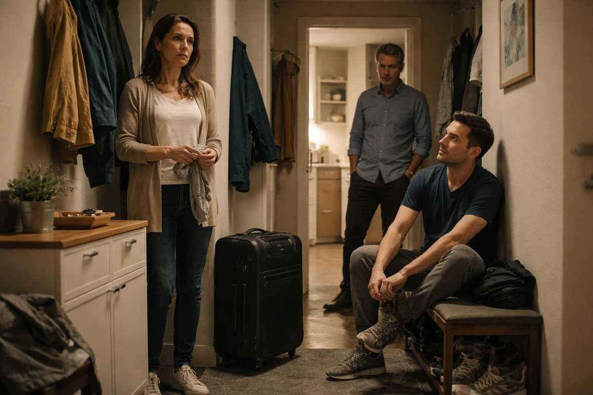 Утром Денис вышел из гостевой уже одетый: джинсы, тёмный свитер, куртка в руке. Чемодан стоял в прихожей. На кухне Лариса наливала Полине чай в термокружку, Сергей резал хлеб.