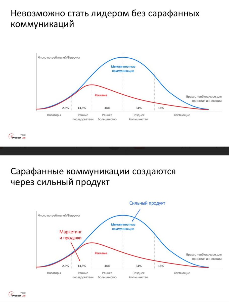 Невозможно стать лидером без сарафанного радио. Сарафанные коммуникации создаются через сильный продукт. 🔵 Это напрямую связано с долиной смерти, которую проходят все стартапы. Кстати, где находится эта Долина Смерти ☠️, я тоже досконально узнала только сейчас. Находится она на этапе между ранними последователями и ранним большинством - на графике в заголовке обычно рисуется пропасть между этими двумя категориями клиентов. 🔵 А речь была о том, что рекламные деньги работают только в начале запуска продукта или проекта. А вот когда проект проходит долину смерти и выходит в уверенное масштабирование, то есть переходит в зону ранних последователей, то именно в этот момент ❗️ начинают работать сарафанные коммуникации, а значимость рекламных денег сильно снижается. 🔵 И в обратную сторону. Если сарафанное радио развернуть слишком рано через платные инструменты, это будет ничем не подтверждённый хайп. А ничем не подтверждённый хайп может навредить дальнейшем успеху продукта. 🔵 Напишите, н