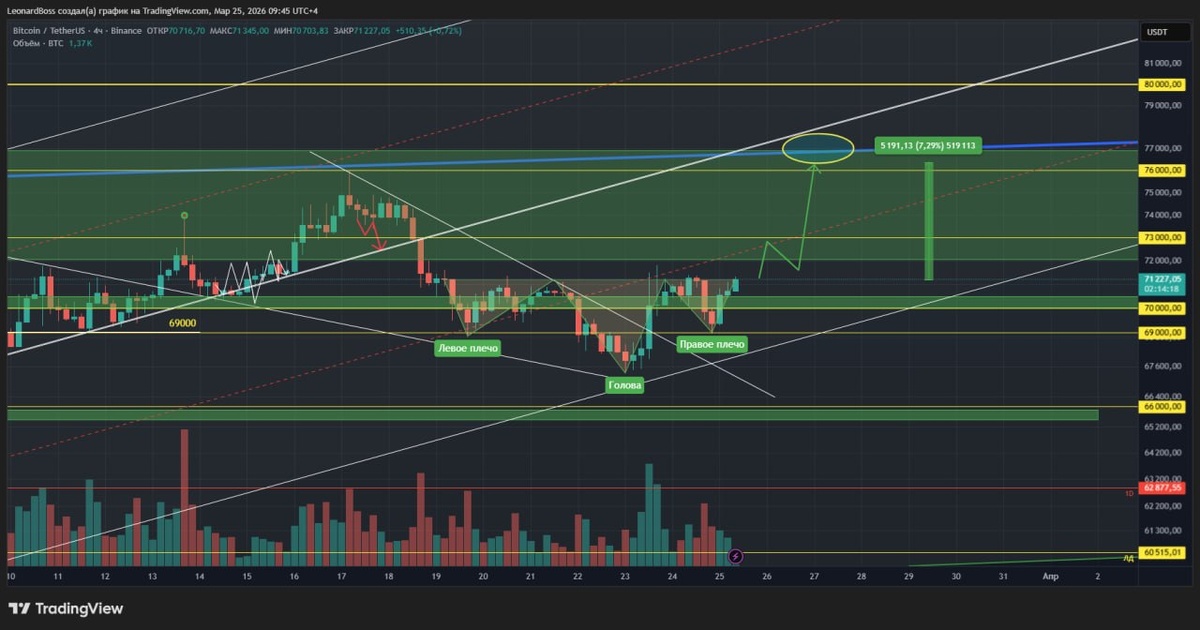 )😎 25 марта 2026 года. 09:27 Dubai 💸 Биткоин: 71.100$🔼 📊 Объем торгов: 294млрд$🔼 ❌ Ликвидации: 223млн$🔽 ☄️ Индекс страха: 14 ☄️ P.s. ✔️BTC = продолжает пилить зону уровня 70К, ликвидируя каждую очередную попытку запрыгнуть выше = день закрылся позитивно для продолжения роста = основные уровни сверху 73К и 76К. На сегодня прорыв 72К = смотрим лонги! ✔️ETH = ключевой локальный уровень внимания снизу 2100$ вчера отработал замечательно! На 4Н ТФ есть прорыв локальной нисходящей трендовой сопротивления = по закрытию текущей 4Н зеленой свечи произойдет закреп = пробой 2200 = ожидаемый рост в сторону 2500$! ✔️Рыночные объемы в восходящем тренде, ликвидации откатили на ночном отскоке альтов = маржинальнальщики в паузе и неопределенности = отличный триггер для продолжения роста всего рынка. При этом индекс страха оставаясь в своей любимой яме подтверждает данный настрой! ✔️Ситуация в мире = всё больше новостей о текущей фазе переговоров между сторонами конфликта на Ближнем Востоке,