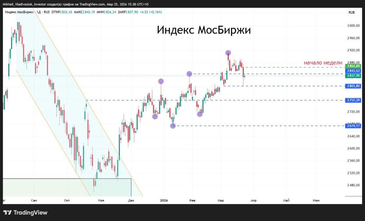 🤓 -Начать хочется с того, что США и Иран объявят о месячном перемирии, его разрабатывают Уиткофф и Кушнер. Рынки отреагировали позитивом, Нефть скорректировалась ниже. Снижение цены на нефть=падение нефтегазового сектора РФ. Что даст дополнительное давление на индекс -Многие акции РФ перепроданы. У меня прям большой список получился шортовых бумаг. Когда идет доминация шорта над лонгом, как правило рынок отскакивает. Постоянно падать мы тоже не можем. -Хотя индекс МосБиржи с начала недели корректируется, мы находимся в восходящей тенденции, поэтому я бы присматривался сейчас к лонговым больше инструментам. Ну и не забываем, что это рынок и тут может быть всё что угодно. Поэтому исключаем свою веру из торговли. По графику: $IMOEXF Минимумы и максимумы повышаются. Поэтому рассматриваются пока покупки, всё что выше 2803. $MXM6 Корректируется в рамках восходящего канала. Можно сказать, что закрыли ГЭП+ниже зона поддержки. Оттуда жду реакцию покупателя. Если и рассматривать то только