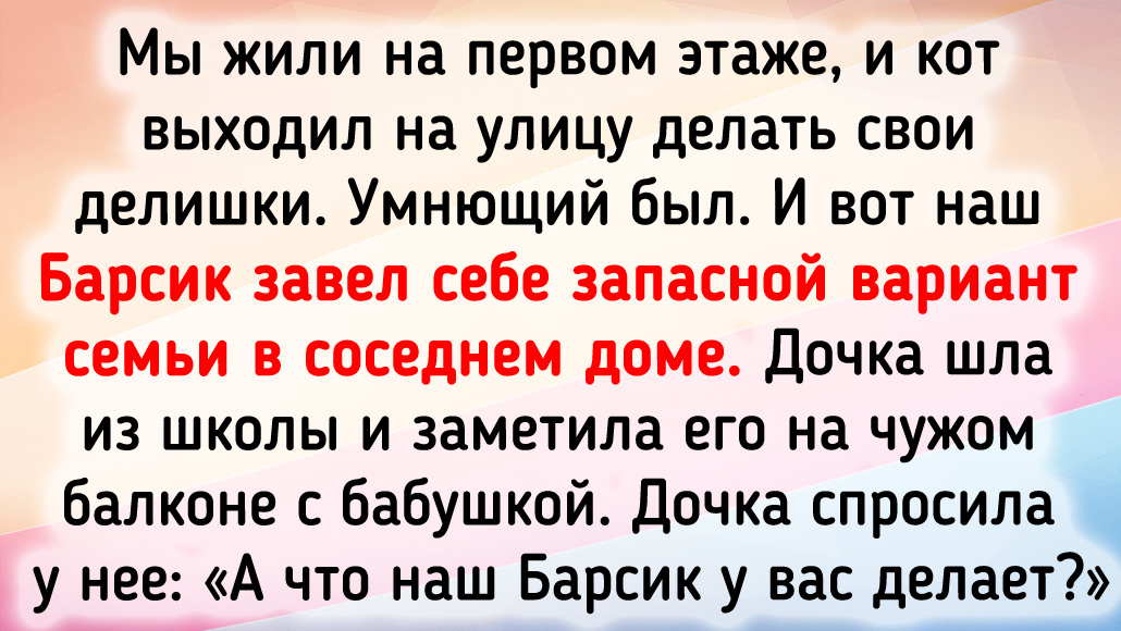 Мы жили на первом этаже, и кот выходил на улицу делать свои делишки. Умнющий был. И вот наш Барсик завел себе запасной вариант семьи в соседнем доме. Дочка шла из школы и заметила его на чужом балконе с бабушкой. Дочка спросила у нее: «А что наш Барсик у вас делает?» Бабушка была уверена, что кот — ее, и звала его Кролик. А я все думала, откуда он иногда угощения нам приносил: в форточку как-то принес бедро индейки огромное. Я увидела и отругала, думала, что из мусорки стащил. © Линда / ADME